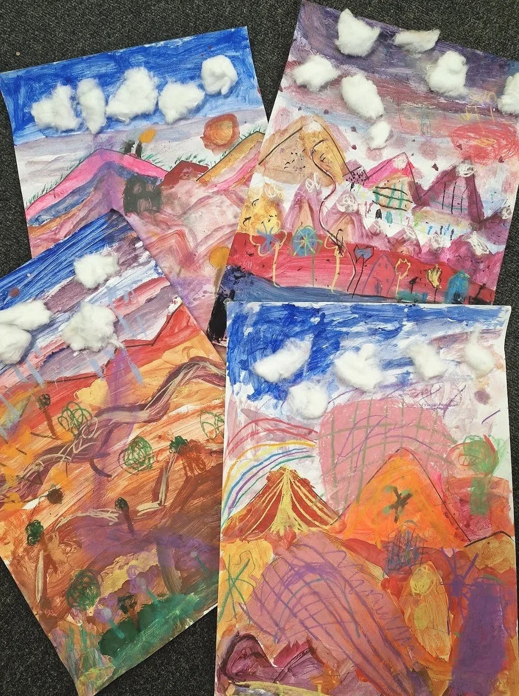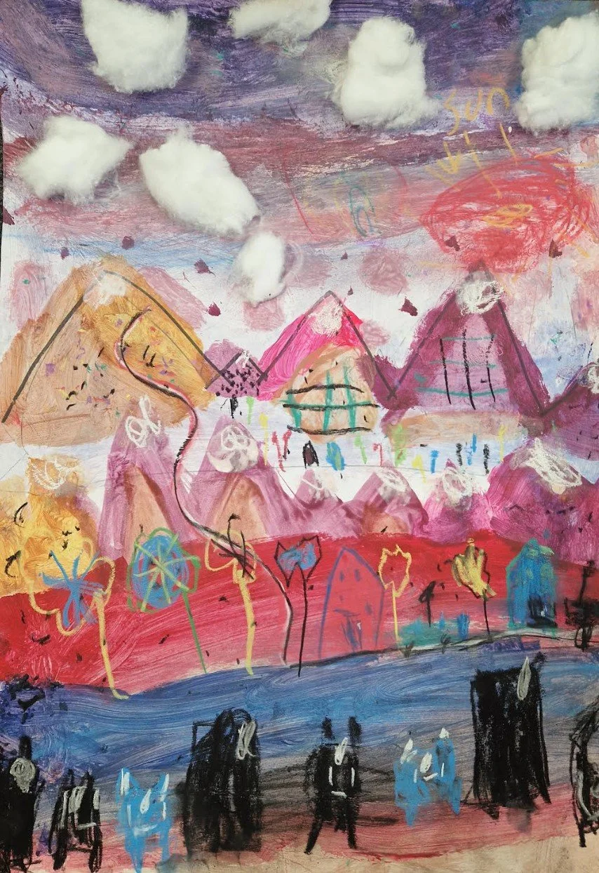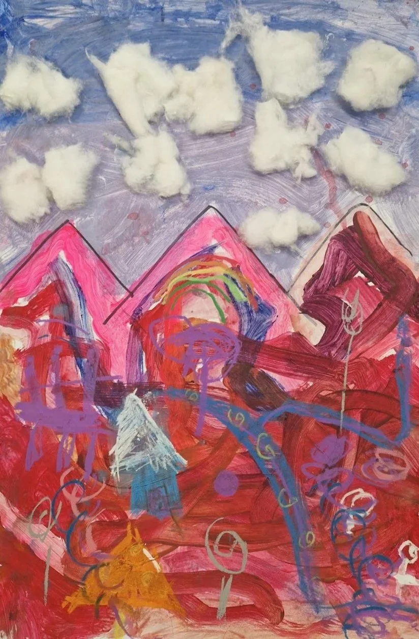 Our Mixed Media Mountain Workshop explores expressive landscape art using paint, oil pastels and collage techniques. Students build dramatic mountain scenes through blending, layering colour and adding tactile elements such as cotton wool clouds for atmosphere and depth. A creative, experimental session designed to develop confidence with mixed media while producing a bold, textured finished artwork.